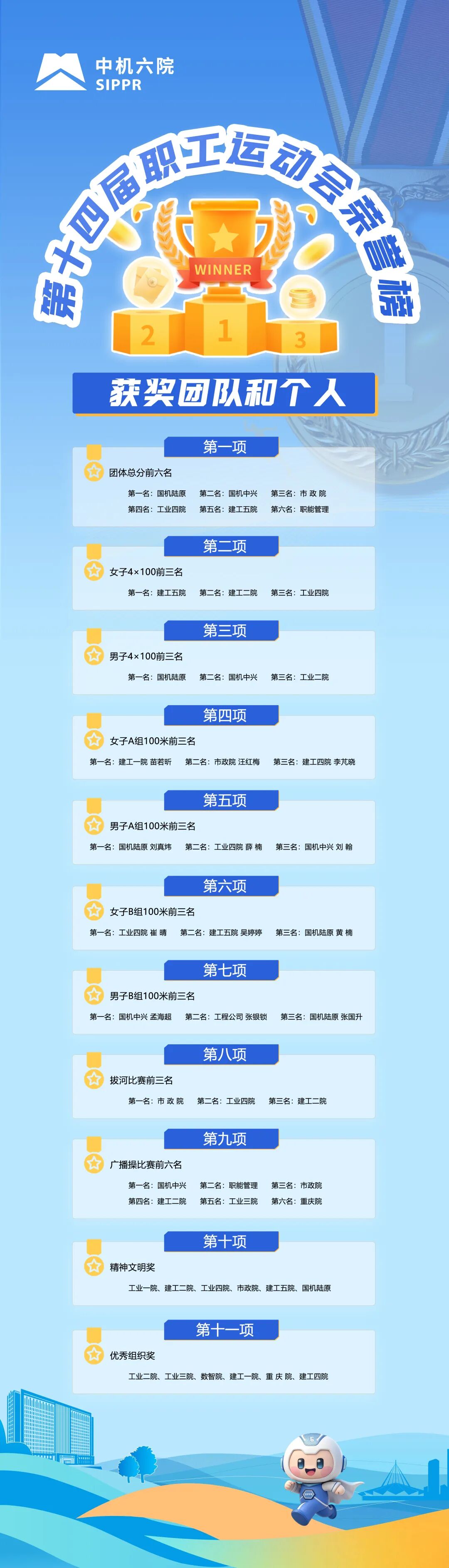 經(jīng)過一天緊張激烈的比賽,國機陸原、國機中興、市政院、工業(yè)四院、建工五院、職能管理獲得團體總分前6名。