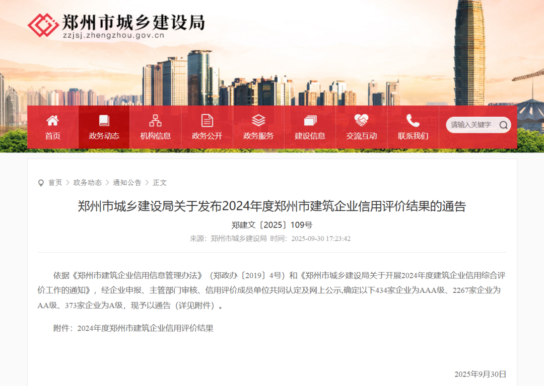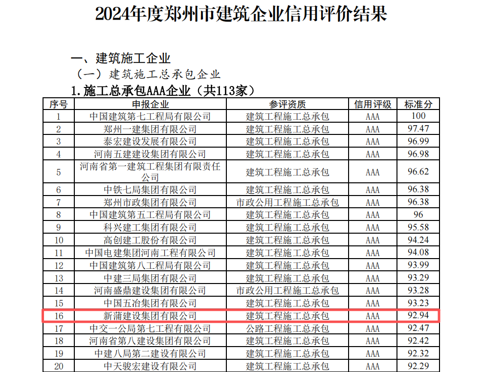 近日,鄭州市城鄉(xiāng)建設(shè)局發(fā)布《關(guān)于發(fā)布2024年度鄭州市建筑企業(yè)信用評(píng)價(jià)結(jié)果的通告》(鄭建文〔2025〕109號(hào)),新蒲建設(shè)集團(tuán)有限公司憑借深厚的行業(yè)積淀、扎實(shí)的技術(shù)實(shí)力與優(yōu)異的信用表現(xiàn),在此次評(píng)價(jià)中成功斬獲建筑工程施工總承包AAA級(jí)榮譽(yù)。