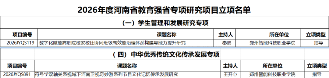 近日,中共河南省委教育工作委員會(huì)、河南省教育廳聯(lián)合印發(fā)《關(guān)于公布 2026 年度河南省教育強(qiáng)省專(zhuān)項(xiàng)研究項(xiàng)目立項(xiàng)名單的通知》,河南省僑商聯(lián)合會(huì)駐會(huì)執(zhí)行會(huì)長(zhǎng)單位鄭州智能科技職業(yè)學(xué)院兩項(xiàng)課題憑借扎實(shí)的研究基礎(chǔ)與創(chuàng)新的研究視角成功獲批。