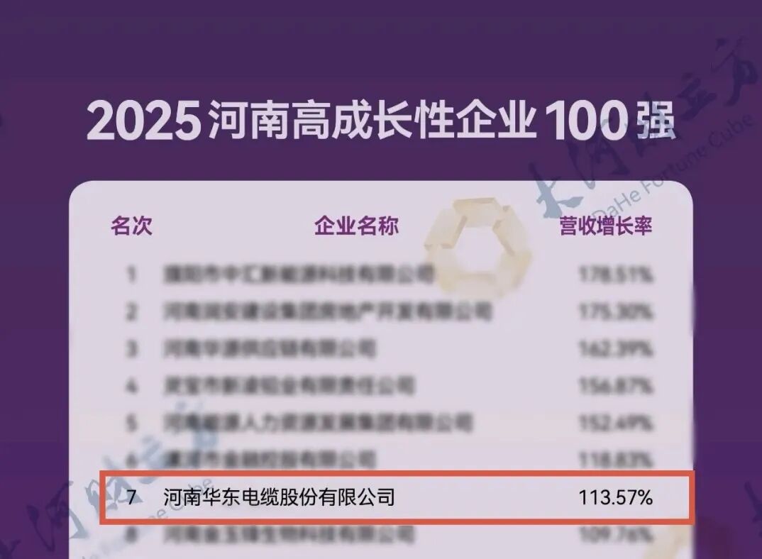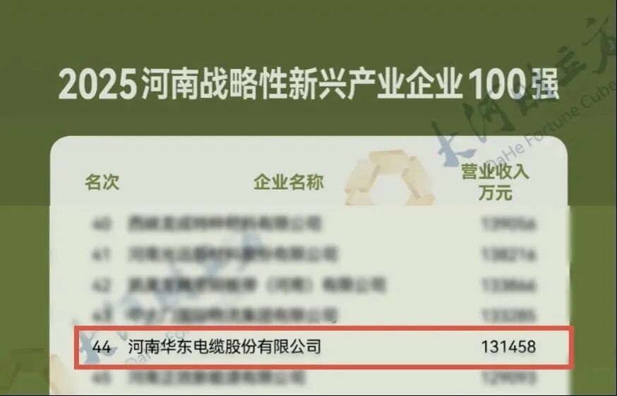 11月12日,由河南省企業(yè)聯(lián)合會(huì)、河南省企業(yè)家協(xié)會(huì)主辦,河南仰韶酒業(yè)有限公司承辦的“2025河南企業(yè)100強(qiáng)發(fā)布會(huì)”在鄭州隆重召開(kāi)。本次發(fā)布會(huì)公布了多項(xiàng)權(quán)威榜單,華東電纜憑借卓越的綜合實(shí)力和高質(zhì)量發(fā)展成果,成功入選“2025河南高成長(zhǎng)性企業(yè)100強(qiáng)”第七名,同時(shí)榮獲“2025河南戰(zhàn)略性新興產(chǎn)業(yè)企業(yè)100強(qiáng)”第四十四名,展現(xiàn)出強(qiáng)勁的發(fā)展勢(shì)頭和創(chuàng)新能力。