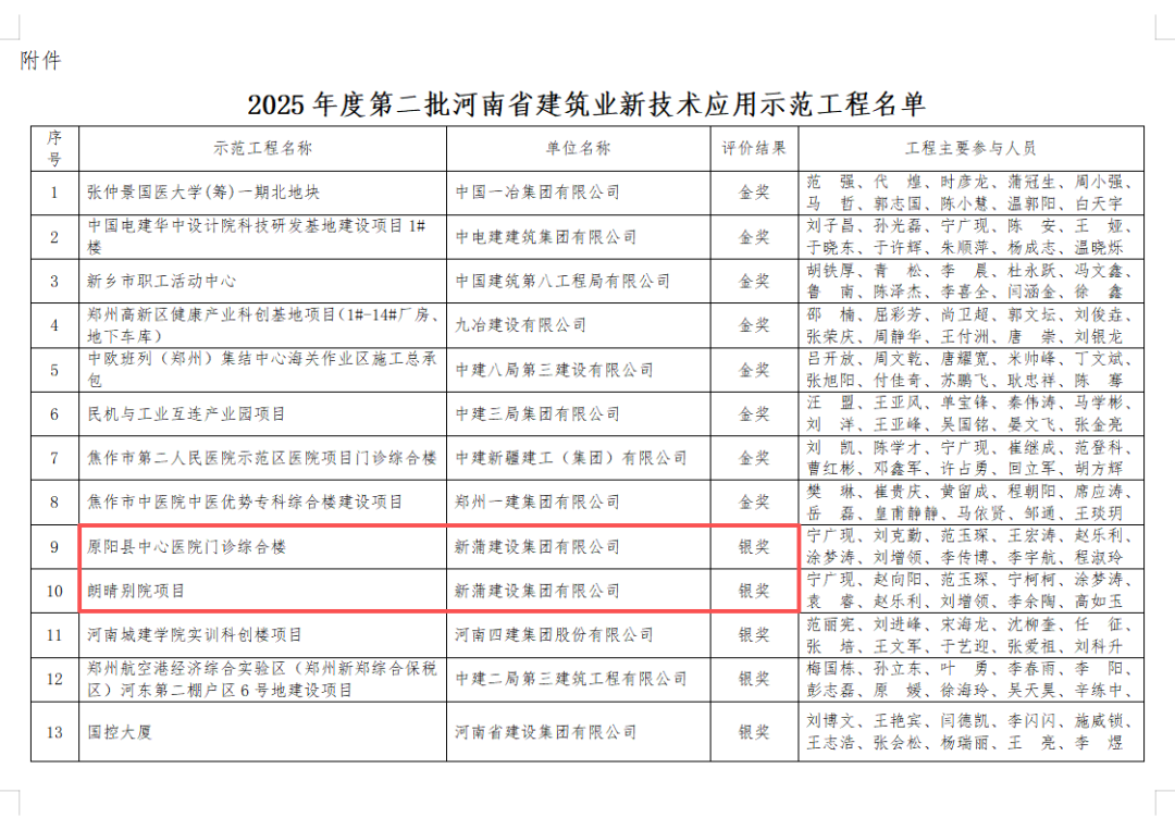 近日,河南省建筑業(yè)協(xié)會公布2025年度第二批示范工程名單,新蒲建設集團承建的朗晴別院項目、原陽縣中心醫(yī)院門診綜合樓項目憑借突出的技術創(chuàng)新與綠色施工成效,獲評“河南省建筑業(yè)新技術應用示范工程”、“河南省建筑業(yè)綠色施工示范工程”,彰顯了新蒲建設集團在科技建造與綠色發(fā)展領域的標桿實力。