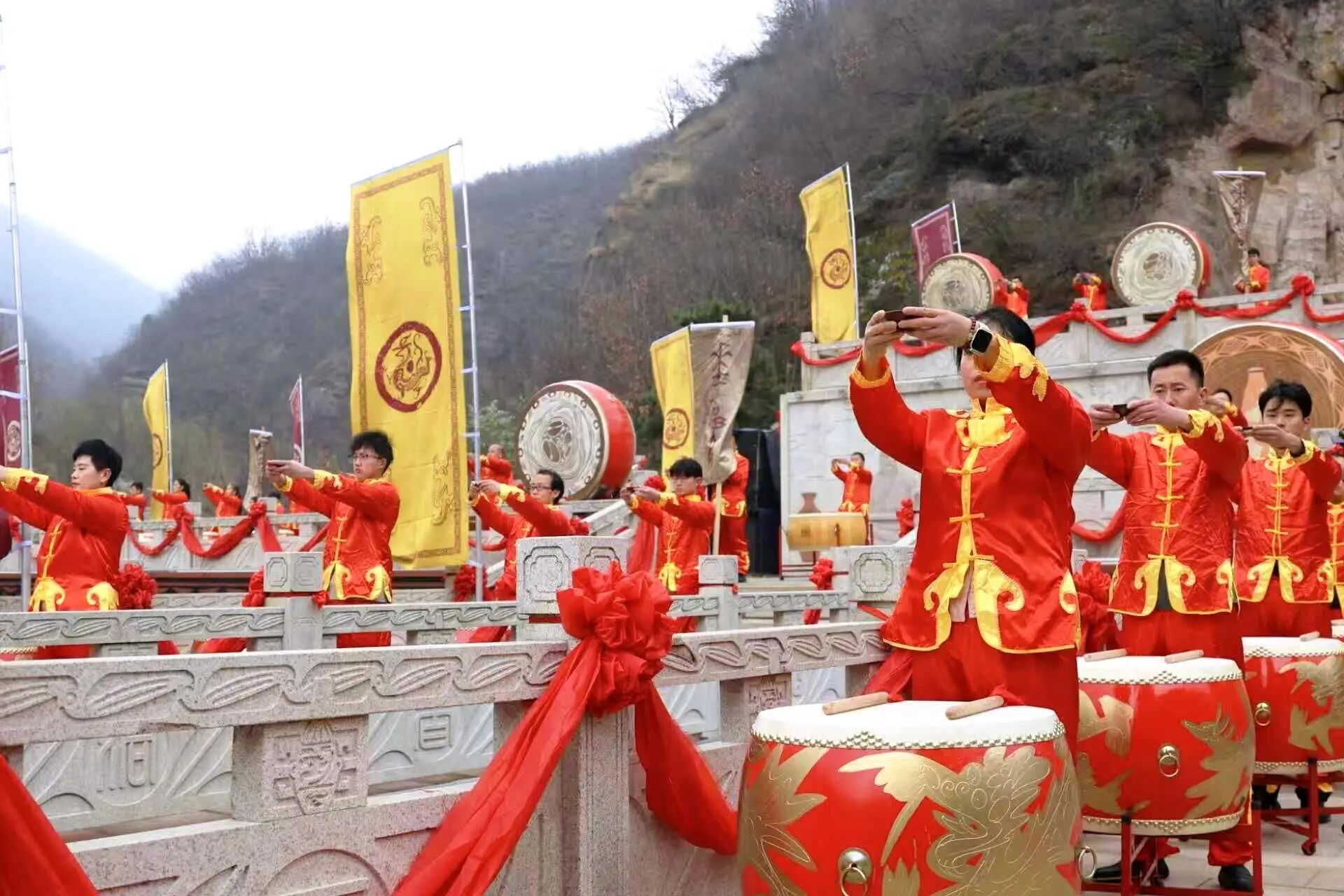 隨后,敬酒環(huán)節(jié)將儀式推向首個(gè)高潮?,F(xiàn)場(chǎng)所有鼓手高舉源自仰韶的陶香美酒,行三敬之禮:一敬天地風(fēng)雷,允我春歸;再敬先祖黃帝,鼓魄長(zhǎng)存;三敬四海同袍,共此晨昏!清冽的酒漿自彩陶壇傾瀉,千年酒香在山谷中彌漫,與悠遠(yuǎn)的祭文交織,營(yíng)造出貫通古今的莊嚴(yán)氛圍。