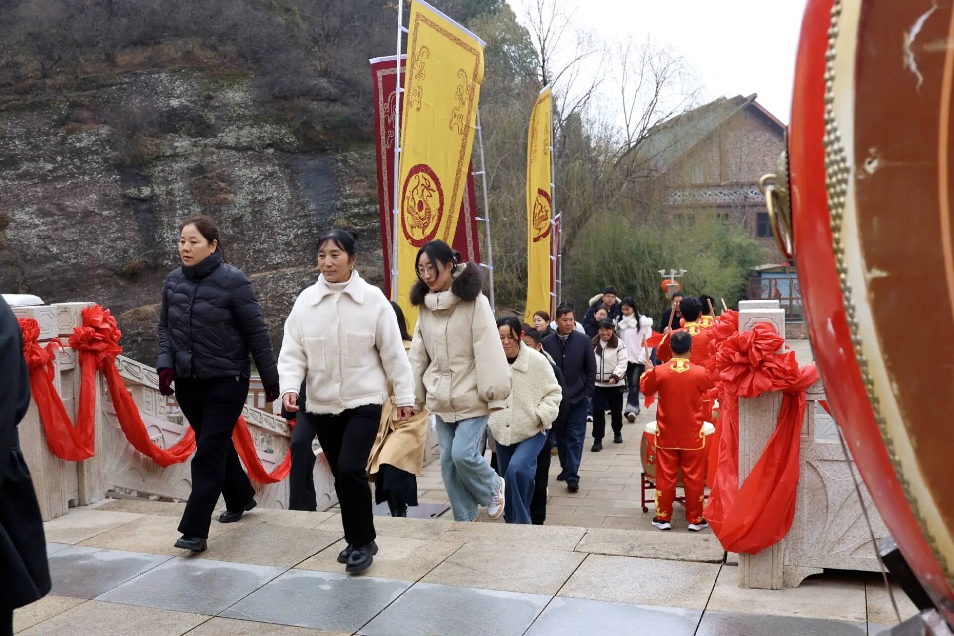 真正的“醒春”之魂,在于撼天動(dòng)地的鼓聲。80面夔牛戰(zhàn)鼓形成陣列,身著紅衣的鼓手一齊揮動(dòng)鼓槌,鼓點(diǎn)如春雷滾動(dòng)、似海潮奔涌的澎湃聲浪,在群山間隆隆回蕩,氣勢(shì)磅礴。近百名游客在感召下接過鼓槌,奮力擊鼓,在激昂的節(jié)奏中親身實(shí)踐著這場(chǎng)古老的“喚醒”儀式,體味先民對(duì)自然的敬畏與祈愿。儀式尾聲,伴隨著悠長(zhǎng)的鼓樂,陶香洞天景區(qū)大門緩緩洞開,這一極具象征意義的環(huán)節(jié),既寓意著古老的仰韶文化熱情擁抱八方來客,也象征著生機(jī)勃勃的春天正式降臨人間。